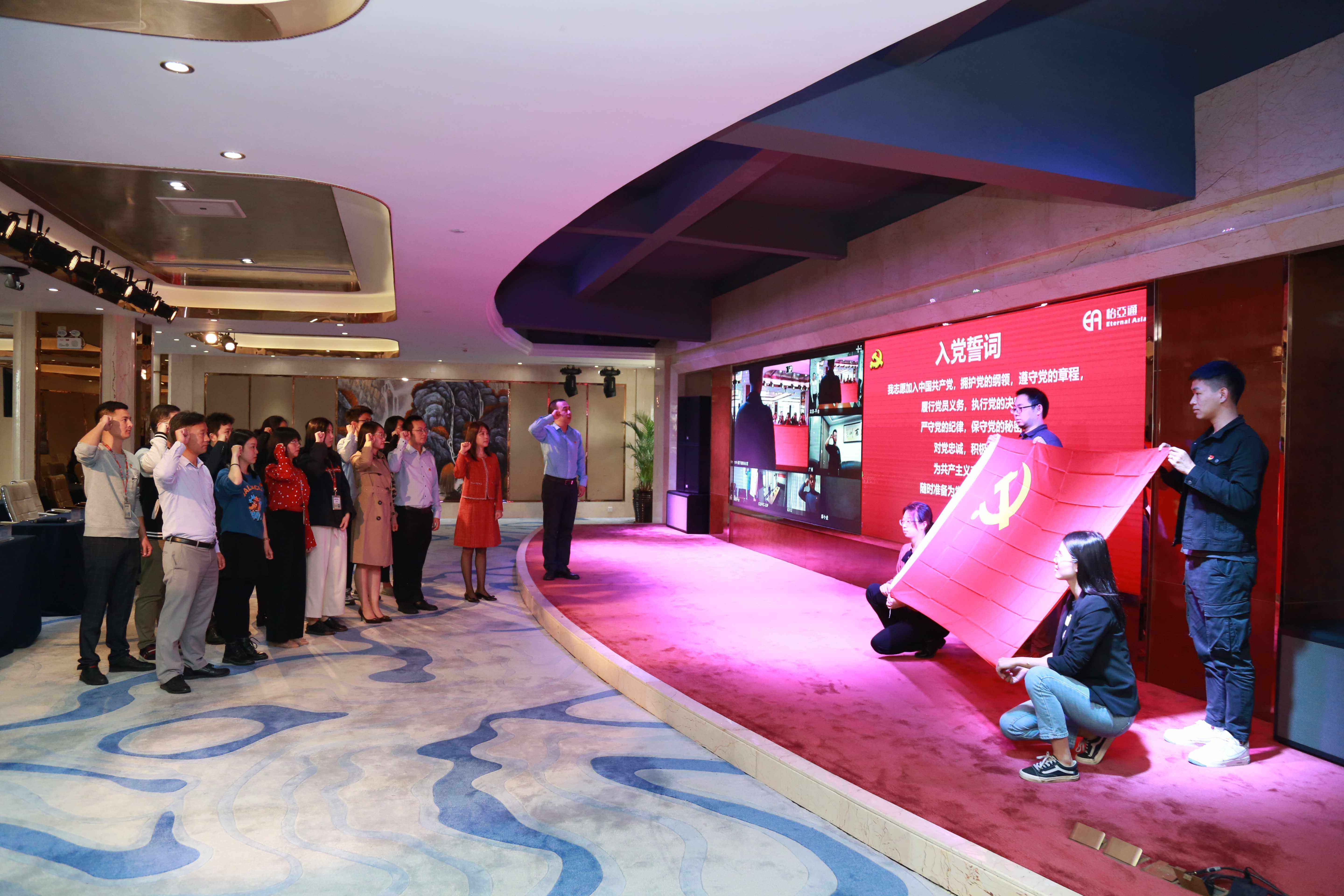 学史明理、学史增信、学史崇德、学史力行,现场回顾了公司发展历程、回望百年前中共一大召开的党史学习、聆听一位80岁耋耄老党员扎根深圳,无私敢干坚守敢干坚守岗位20年的故事以及优秀党员员工廖富生分享了他在疫情期间克服种种困难,顺利完成香港仓自管切换及提升团队综合运营能力为企业创造超百万的价值。在寿星的共同见证下,2020年新入党的预备党员在现场及线上视频接入同步进行了入党宣誓。铿锵誓言,是党对党员的要求,也是党员向党表示自己愿意承担的责任、坚定的信念和奋斗的决心。